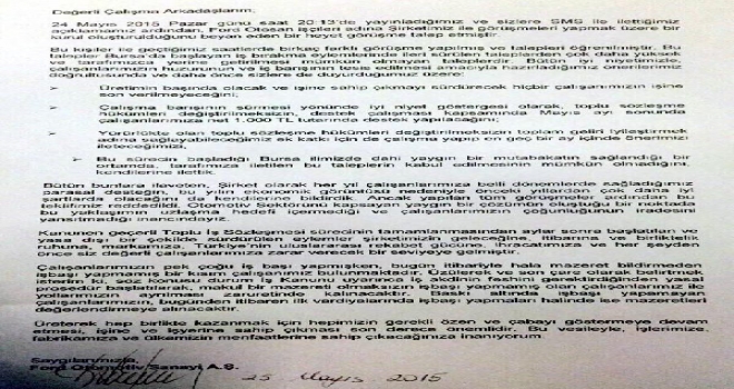 Çalışanlarımızın pek çoğu işbaşı yapmışken bugün itibarıyla hala mazeret bildirmeden işbaşı yapmamış bir kısım çalışanımız bulunmaktadır. Üzülerek ve son çare olarak belirtmek isterim ki, sözkonusu durum İş Kanunu uyarınca iş akdini feshini gerektirdiğinden yasal prosedür başlatılarak, makul bir mazereti olmaksızın işbaşı yapmamış olan çalışanlarımız ile yollarımızın ayrılması zaruretinde kalınacaktır. Baskı altında işbaşı yapamayan çalışanlarımızın bugünden itibaren ilk vardiyalarında işbaşı yapmaları halinde mazeretleri değerlendirmeye alınacaktır."
