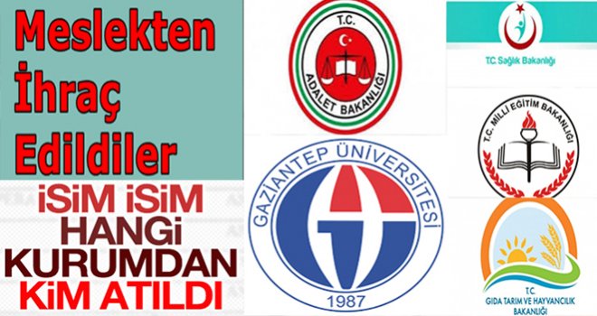 Gaziantep’te kamu ve kurumlarından görev yapan 167 kişi ihraç edildi. Gaziantep’te en çok ihraç Sağlık Bakanlığı ve Milli Eğitim Bakanlığı’nda yaşandı. Bu kurumları Adliye ve Gaziantep Üniversitesi takip etti. İhraç edilenler arasında Adliyeden 26, Milli Eğitim Müdürlüğü’nden 58, Sağlık Bakanlığı’ndan 60, Gaziantep Üniversitesi’nden 1 profesör olmak üzere 13 akademisyenin kurumla ilişiği kesildi.