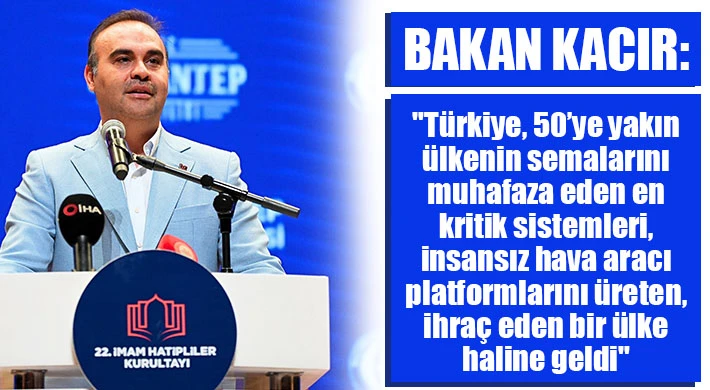 Sanayi ve Teknoloji Bakanı Mehmet Fatih Kacır, Gaziantep'te düzenlenen ÖNDER 22. İmam Hatipliler Kurultayı'na katıldı. Programda konuşan Bakan Kacır, Afrika kıtasının semalarını baştan başa Türk SİHA’larıyla muhafaza ettiğini söyleyerek, Türkiye’nin, 50’ye yakın ülkenin semalarını muhafaza eden en kritik sistemleri, insansız hava aracı platformlarını üreten, ihraç eden bir ülke haline geldiğini belirtti.
