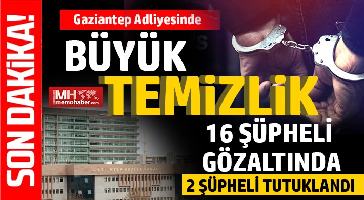 Gaziantep'te adliyede yapılandığı tespit edilen şahıslara yönelik rüşvet ve uyuşturucu operasyonunda aralarında savcı, avukat, polis, katip ve adliye çalışanlarının olduğu 16 şüpheli gözaltına alındı. Yakalanan şahıslardan 2 katip tutuklanırken diğer şüphelilerin işlemlerinin ise sürdüğü belirtildi.