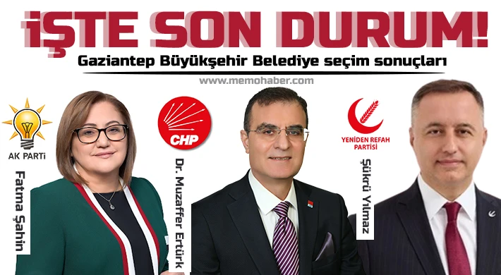 Fatma Şahin Gaziantep Büyükşehir Belediye başkanlık yarışını önde götürür iken CHP adayı Muzaffer Ertürk ikinci sırada yer aldı. Yeniden Refah bir sürpriz yaparak Gaziantep’te 3. parti oldu. Yeniden Refah Partisi’nin adayı Şükrü Yılmaz ise seçmenin %16’lık oyunu aldı. Oy sayma işlemleri sürüyor.