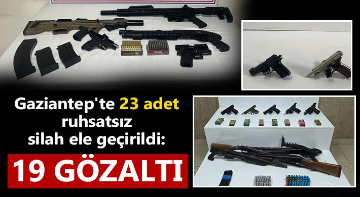 Gaziantep'te jandarma ekiplerinin son bir ayda yaptığı operasyonlarda 23 adet ruhsatsız silah ile çok sayıda fişek ele geçirildi, 19 şüpheli hakkında yasal işlem başlatıldı.