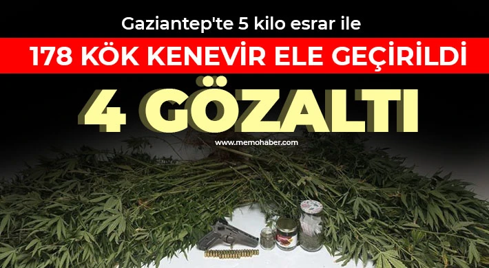 Gaziantep'te jandarma ekiplerinin operasyonunda 5 kilo kubar esrar ile 178 kök kenevir bitkisi ele geçirildi, 4 şüpheli gözaltına alındı.