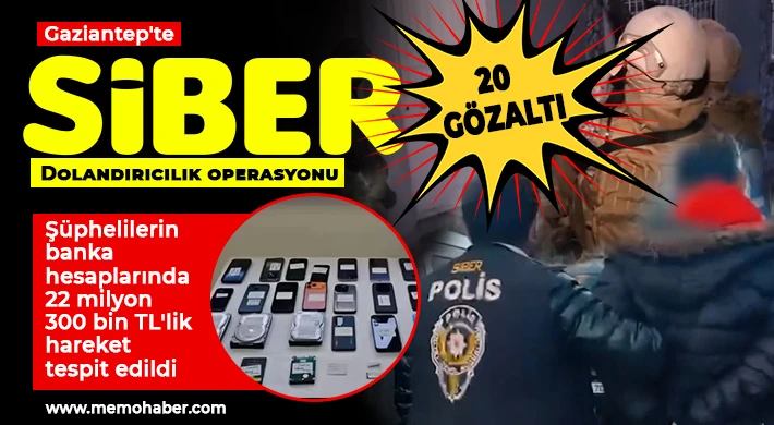Gaziantep'te Cumhuriyet Başsavcılığımız koordinesiyle İl Emniyet Müdürlüğü Siber Suçlarla Mücadele Şube Müdürlüğü ekiplerince siber dolandırıcılık olaylarına yönelik operasyon yapıldı. Çok sayıda ekibin destek verdiği operasyon çerçevesinde belirlenen adreslere şafak vakti eş zamanlı baskın yapıldı. Adreslerde yapılan aramalarda 24 adet cep telefonu, 18 adet sim kart, 5 adet flaş bellek, 4 adet bilgisayar, 2 adet tablet ve 2 adet hard disk ele geçirildi. Operasyon sonucunda, bilişim sistemlerinin kullanılması suretiyle dolandırıcılık yaptığı tespit edilen ve banka hesaplarında 22 milyon 300 bin TL'lik hareket tespit edilen 20 şüpheli gözaltına alındı.