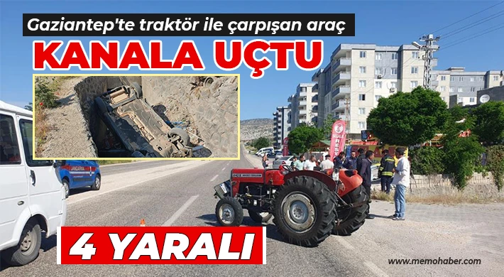 Gaziantep'in Yavuzeli ilçesinde traktör ile çarpışıp yol kenarındaki su kanalına uçan otomobildeki 4 kişi yaralandı.