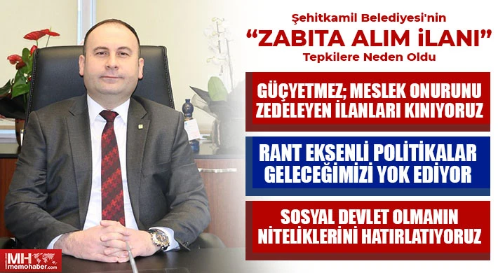 Şehitkamil Belediyesi'nin, zabıta memuru alımı için açtığı ilan tepkilere ve tartışmalara neden oldu. İlanda zabıta memurluğuna başvurmak için, “Mühendis, mimar ve şehir plancısı” olma şartının yer alması, “Meslek onurunun zedelenmesi” ve “Gençlerin geleceğe dair umutlarına saldırı” olarak değerlendirildi.
