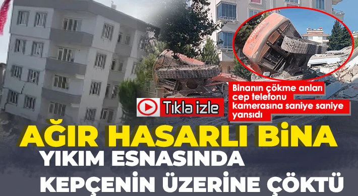 Gaziantep'te depremde ağır hasar alan bir bina, kontrollü yıkım sırasında kepçenin üzerine çöktü. Yaşanan paniğin cep telefonu kamerasına yansıdığı olayda kepçe enkaz altında kalırken, operatör ise son anda canını kurtardı.