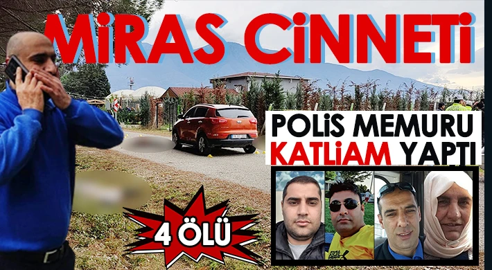 Bursa'da ailesiyle önceden miras yüzünden husumet bulunan polis memuru, tartıştığı ailesinden annesi, iki ağabeyi ve yengesi olmak üzere 4 kişiyi tabancayla vurarak öldürdü. Zanlı, meslektaşları tarafından gözaltına alındı.