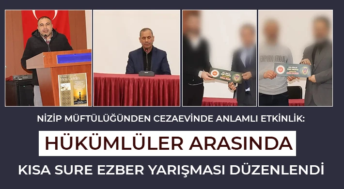 Nizip İlçe Müftülüğü, “İyilik Haftası” etkinlikleri kapsamında anlamlı bir organizasyona imza attı. Nizip T Tipi Kapalı Ceza İnfaz Kurumunda hükümlüler arasında kısa surelerin mealleriyle birlikte ezbere okunmasını teşvik eden bir yarışma düzenlendi.