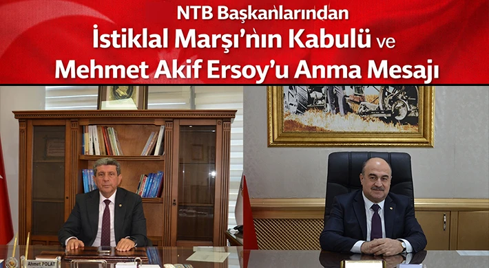 İstiklal Marşımızın milletimizin bağımsızlık iradesinin en güçlü ifadesi olduğunu belirten NTB Başkanları mesajlarında şu ifadelere yer verdiler; “Milli Şair Mehmet Akif Ersoy’un ölümsüz eseri İstiklal Marşımızın 12 Mart 1921 tarihinde Türkiye Büyük Millet Meclisi tarafından ‘Milli Marş’ olarak kabul edilişinin 105’inci yıl dönümünü kutlamanın onur ve gururunu yaşıyoruz.