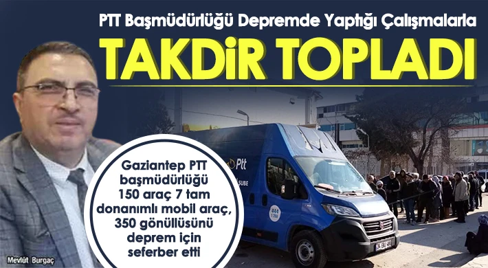 PTT Bölge Başmüdürü Mevlüt Burgaç depremin ilk satlerinden itibaren depremzedelerin yardımına koştuklarını belirterek, “PTT A.Ş olarak depremin ilk anından itibaren hızlı bir aksiyon alarak depremzedelere her türlü yardıma koşmuştur. Gaziantep PTT başmüdürlüğü olarak depremin ilk anından itibaren vatandaşlarımızın ihtiyaçlarını gidermek için elimizde bulunan tüm araç filomuzu harekette geçirerek pandemide olduğu gibi tüm çalışanlarımız yardıma koşmuştur. Diğer İllerden tam donanımlı mobil araçlar getirilerek şehrimizin çeşitli bölgelerinde ve Araban, Oğuzeli, İslahiye ve Nurdağı ilçelerimizde hizmete sunulmuştur. Depremde zarar görmeyen tüm işyerlerimiz hizmete açılarak halkımızın hizmetine sunulmuştur. Güçlü araç filomuzla Kahramanmaraş, Adıyaman, Malatya ve Hatay illerine ihtiyaç duyulan yardım malzemeleri taşınmıştır” şeklinde konuştu.