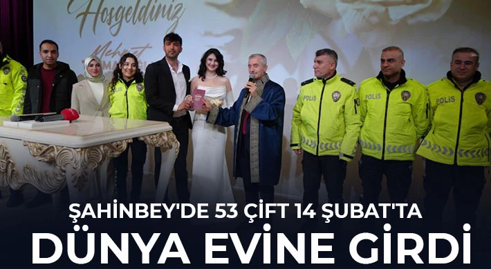 Gaziantep'te evlenmek isteyen 53 çift, 14 Şubat Sevgililer Günü'nde hayatlarını birleştirme kararı aldı. Çiftlerin nikah akdini Şahinbey Belediye Başkanı Mehmet Tahmazoğlu gerçekleştirdi.