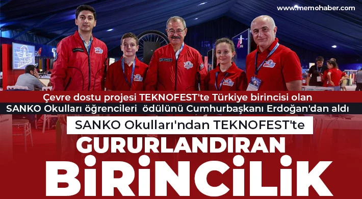 TEKNOFEST Akdeniz ödül töreni Cumhurbaşkanı Recep Tayyip Erdoğan'ın katılımıyla Adana Şakirpaşa Havalimanı'nda gerçekleştirildi. Çevre ve Enerji Teknolojileri Yarışması “İlkokul-Ortaokul” düzeyinde Türkiye birinciliği elde ederek büyük bir başarıya imza atan SANKO Okulları 8'inci sınıf öğrencileri Neva Doktoroğlu ve Kerem Utku Kaleli ile danışman öğretmenleri Fatih Mehmet Günaydın, birincilik ödülünü Cumhurbaşkanı Recep Tayyip Erdoğan'ın elinden aldı.