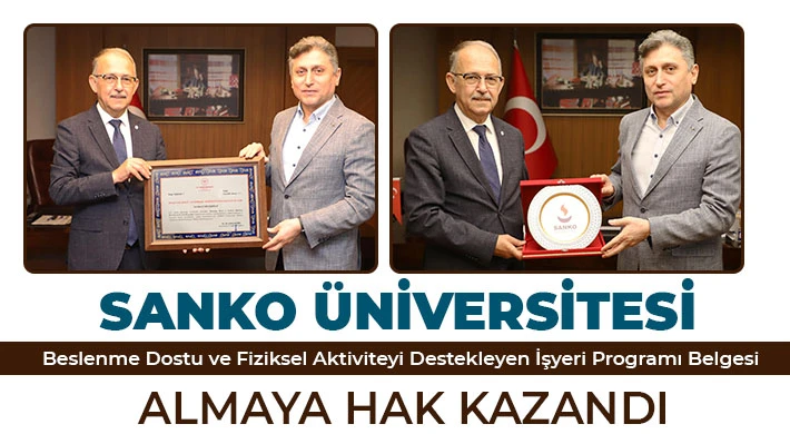 Sağlık Bakanlığı tarafından yürütülen “Beslenme Dostu ve Fiziksel Aktiviteyi Destekleyen İşyeri Programı” kapsamında yapılan değerlendirmede, SANKO Üniversitesi, sağlıklı beslenme ve hareketli hayat koşullarına uygun buluğundan “Beslenme Dostu ve Fiziksel Aktiviteyi Destekleyen İşyeri Programı” belgesi almaya hak kazandı.