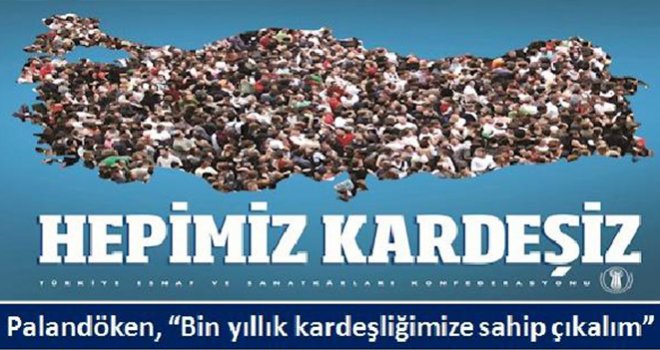 2 milyonu aşkın berber, bakkal, kasap, manav, taksi, dolmuş, halk otobüsü, servis aracı olmak üzere 494 meslek dalının yürütüldüğü işyerlerine 'HEPİMİZ KARDEŞİZ' afişi asılacağını belirten TESK Genel Başkanı Bendevi Palandöken, "İçimizi yakan ve toplum olarak bizi hüzne boğan bu olaylar mutlaka son bulmalıdır" dedi.