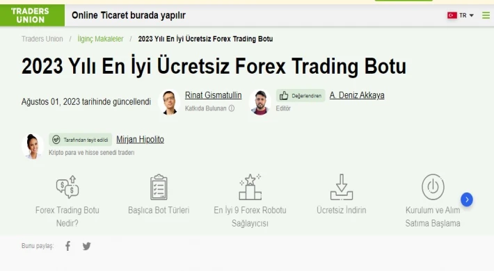 İdeal forex trading botunu seçmek, mevcut sayısız seçenek nedeniyle zor olabilir. Trader'lara karar verme süreçlerinde yardımcı olmak için TU, maliyet, özellikler, güvenilirlik, kullanıcı yorumları ve daha fazlası gibi faktörleri göz önünde bulundurarak en iyi forex robotlarının ve EA sağlayıcılarının bir listesini hazırladı. Traders Union'ın en iyi seçimlerini inceleyelim: