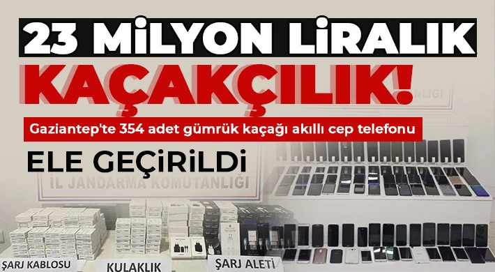 Gaziantep'te jandarma ekiplerince 2 farklı iş yerine düzenlenen operasyonda piyasa değeri 23 milyon 120 bin TL olan 354 adet gümrük kaçağı akıllı cep telefonu ele geçirildi. Gözaltına alınan 2 şahıs hakkında yasal işlem başlatıldı.