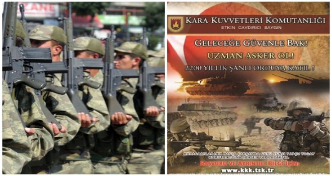 Kara Kuvvetleri Komutanlığı, uzman asker ihtiyacını karşılamak için 2 bin 300 ile 4 bin TL arasında maaş imkanı ile sözleşmeli er alacak. İzmir ve çevre illerden sözleşmeli er olmak isteyenlerin her hafta çarşamba günü şahsen Bornova'daki 57. Topçu Tugayı'na başvurmaları istendi.