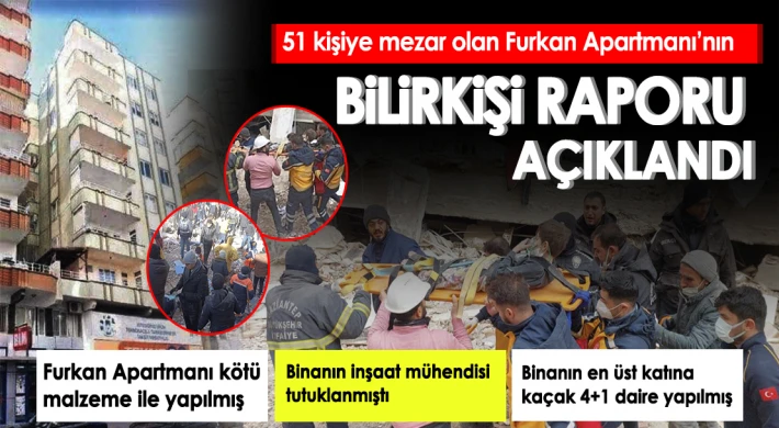 Tutuklama kararının ardından 51 kişiye mezar olan Furkan Apartmanı’nın bilirkişi raporu da açıklandı. Açıklanan bilirkişi raporuna göre 51 kişiye mezar olan Gaziantep’in Nizip ilçesindeki Furkan Apartmanı’nın çok kötü malzeme ile yapıldığı, en üst katına 4+1 kaçak daire yapıldığı ve kesildiği söylenen bina kolonlarının aslında hiç yapılmadığı belirtildi. Rapora göre, Furkan Apartmanı’nın kaçak yapı tarafına doğru çöktüğü ve yıkımın boyutunun bu nedenle büyük olduğu vurgulandı.