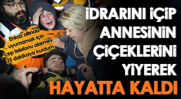 Salonda yatarken depremin olmasıyla enkaz altında kaldığını ifade eden Adnan Muhammet Korkut, "Üşümemek için üzerime battaniyeyi aldım. Hayatta kalmak için kendi idrarımı içtim. Annemin yetiştirdiği çiçeklerin parçaları vardı onu yedim. Ayaklarım da donuyordu. Bir parça kıyafet buldum. Ayağıma çorap yaptım. Süreyi öyle geçirdim. Bulunduğum alan evin salonu ama dirseğimle elimin boşluğu arasında. Diz üstü yürüyemiyordum, asker yürüyüşü yaptım. O şekilde hayatta kalmaya çalıştım. Telefonumu kaybetmiştim ilk başta. 6 saat sonra alarm çaldı. Telefonu elime aldım. Şebeke çekmiyordu. Şebekenin çekmesi için taşların içinde mücadele ettim. 25 dakikada alarm kurdum ki yardım gelirse duysunlar ve uyuyup kalmayayım. Şarj ikinci günü bitti. Çaresizce AFAD’ı bekledim. Dışarıdan çığlık sesleri geliyordu. Köpeğim vardı küçük onun sesi geliyordu. Onların sesi bana geliyor benimkisi gitmiyordu. Sadece yardım bekledim. O an Rabbimden istedim. Rabbimi dilimden düşürmedim. Çıkmak için dua ettim hep. Kendini çaresiz yalnız hissediyorsun, her şeyin boş olduğunu hissediyorsun. Yardımı tek AFAD’dan bekledim. Annemden babamdan ulaşırım diye. Annemle babam kardeşlerim yaşıyor mu, bunun stresi de üzerimdeydi. Kendimi yırttım. Namaz kılmaya çalıştım. Vakit geçmiyordu ilahi okudum. Elimde değnek parçası vardı. Tavana vura vura sesimi duyurmaya çalıştım. 4. gününde AFAD ekibi sağolsun yardıma geldi. Ondan dolayı onlara da teşekkür ediyorum. Allah kimsenin başına vermesin" dedi.