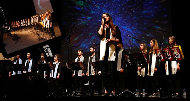 Türk Musikisi Devlet Konservatuarı Öğr. Gör. Hamdi Hikmet Geçin’in sanat yönetmenliğini yaptığı ve enstrümansız yapılan konserde; İstiklal Marşı, Büyük Usta Neşet Ertaş’ın ölümsüz eseri Ahirim sensin, Suda Balık Oynuyor, Sezen Aksu’dan Keskin Bıçak, Teoman Alpay’dan Buruk Acı gibi içimizde yer etmiş birçok eser çeşitli bir yorumla çoksesli olarak dinleyenlerle buluştu.