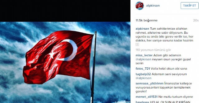 Alp Kırşan sosyal medya hesabından yaptığı paylaşımda, "Göreve hazırım" dedi. Kırşan, sosyal medya hesabında şu ifadelere yer verdi: "Tüm şehitleri-mize Allah'tan rahmet, ailelerine sabır diliyorum. Bu uğurda şu anda bile görev verilirse, her dakika her saniye sonuna kadar hazırım." dedi.