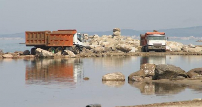 Hüsnü EVREN/AYVALIK(Balıkesir), (DHA)- BALIKESİR'in Ayvalık İlçesi Altınova Mahallesi'ndeki sahil bandında erozyonu önlemek amacıyla yapılan mendirek, tatilcilerin tepkisine neden oldu. Ağır tonajlı kamyonların çalışmalar kapsamında sahil kenarında bulunmasından rahatsız olanlar, tüm sahili kaplayan kaya parçaları yüzünden denizin çamurlaştığını söyledi.