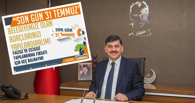 Bazı alacakların yeniden yapılandırılması kanunu kapsamında vadesi geçen borçların yapılandırılmasına ilişkin açıklamada bulunan Şehitkamil Belediye Başkanı Rıdvan Fadıloğlu, vatandaşların en geç 31 Temmuz 2018 Salı günü mesai bitimine kadar borçlarını yapılandırması uyarısında bulundu.