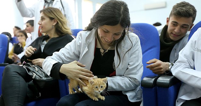 Barınaktan getirilen yavru kedi ve köpek, öğrencilerin ilgi odağı oldu.