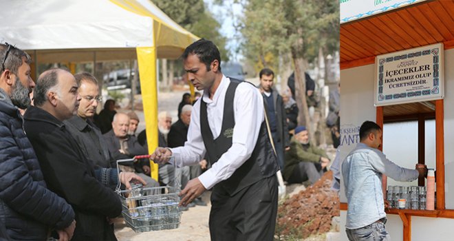 Yaklaşık 1 yıldır mezarlık içerisinde “taziye çadırı” kuran Sağlık ve Sosyal Hizmetler Daire Başkanlığı, bunun yanı sıra ücretsiz su ve çay ikramında da bulunuyor.