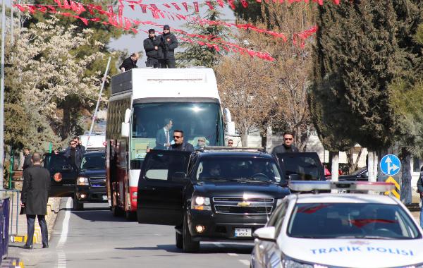 Yoğun güvenlik önlemlerinin alındığı, helikopterin de havadan önlem aldığı karşılamada tören mangasını selamlayan Cumhurbaşkanı Erdoğan, Gaziantepsporlu oyuncularla birlikte apronda fotoğraf çektirdi. Uzun araç konvoyu ile kent merkezine hareket eden Cumhurbaşkanı Erdoğan, yolda kendisine sevgi gösterisinde bulunanları otobüsten selamlayıp çocuklara satranç takımı hediye etti.