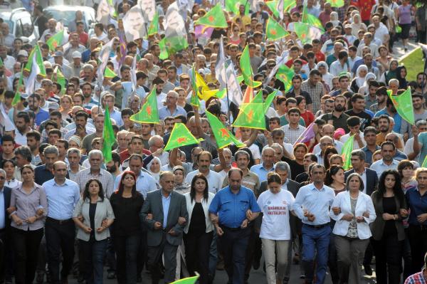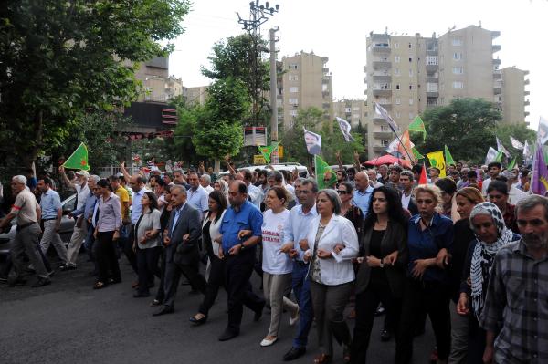 IŞİD'in Kobani'ye yönelik düzenlediği bombalı saldırılar Diyarbakır'da DBP, HDP ve DTK öncülüğünde düzenlenen yürüyüşle protesto edildi. DBP il başkanlığı önünde toplanan ve aralarında HDP Diyarbakır Milletvekilleri, Feleknas Uca, Çağlar Demir, Sibel Yiğitalp, İmam Taşçıer, Diyarbakır Büyükşehir Belediye Başkanı Gültan Kışanak, merkez ve diğer ilçe belediye başkanları ile yaklaşık 20 bin kişi katıldı. Parti yetkilileri, önlem alan polis müdürleriyle yaptığı görüşmenin ardından yaklaşık 3 kilometre mesafedeki Koşuyolu Parkı'na HDP seçim otobüsünden çalınan Kürtçe şarkılar eşliğinde yürüyüşe geçti. Grup yürüyüş sırasında, Abdullah Öcalan, PKK, YPG, YPJ ile 'PKK intikam intikam' sloganları attı.