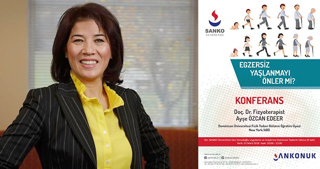 SANKO Üniversitesi tarafından SANKONUK Programı kapsamında, ABD New York Dominican Üniversitesi Fizik Tedavi Programı Araştırma Komitesi Başkanı Doç. Dr. Fizyoterapist Ayşe Özcan Edeer, halka açık konferansta “Egzersiz Yaşlanmayı Önler mi” konusunu anlatacak.