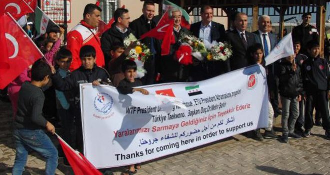Dünya Tekvando Federasyonu Başkanı Başkanı Dr. Chungwon Choue ve beraberindeki heyet, Kilis'te ziyaret ettikleri konteyner kentte barınan ve bu sporu yapan Suriyeli sığınmacılara tekvando kıyafeti dağıttı.