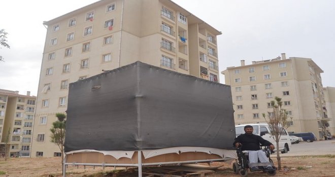 Gaziantep Beykent’te TOKİ’nin yaptığı binada oturan engelli vatandaş, binaya elektrik verilemeyince, 7. kattaki dairesine çıkamadığı için çareyi apartmanın önüne çadır kurmakta buldu.