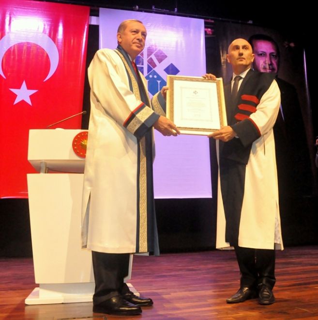 Üniversitede ilk olarak Rektör Taner Yılmaz tarafından fahri doktora unvanı verilerek cübbesi giydirilen Cumhurbaşkanı Erdoğan, daha sonra kürsüde konuşma yaptı.