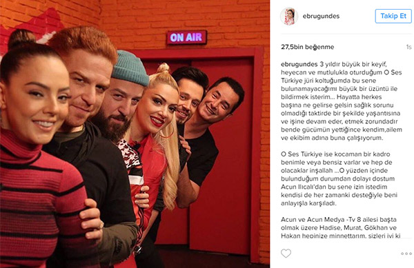 Jüri üyeleri Hadise, Murat Boz, Gökhan-Hakan Özoğuz ve yapımcı Acun Ilıcalı’nın olduğu fotoğrafı yayımlayan ünlü şarkıcı, sağlık sorunu nedeniyle bu kararı aldığını belirtti.