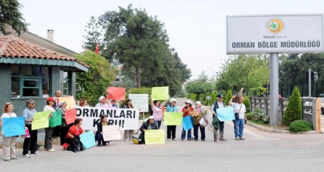 Çevreciler, Orman Bölge Müdürlüğü önündeki açıklamanın ardından bir süre oturma eylemi yaptı ve alkışlarla Orman Bölge Müdürlüğü yöneticilerini protesto etti.