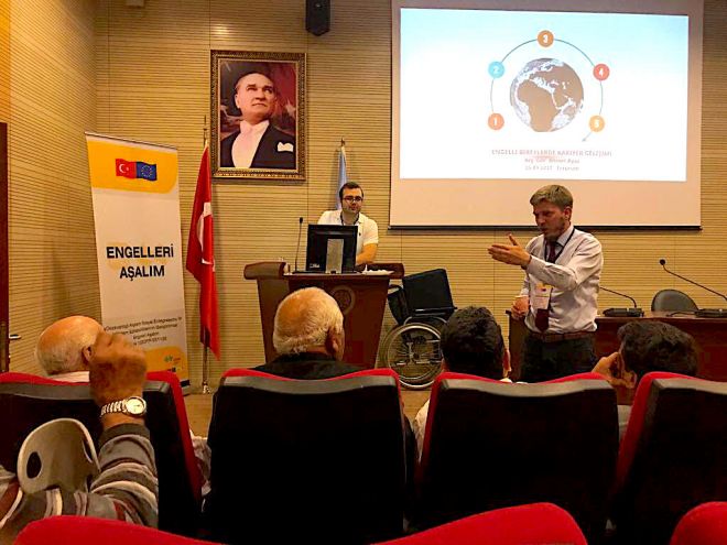 HKÜ Akademisyenleri, engelli derneklerinin bilgilendirilmesine yönelik faaliyetler kapsamında; “Engelli bireylerin kariyer gelişimi ve kariyer yönetimi” ile “İnsan kaynakları yönetimi ve girişimcilik” konularında eğitimler verdi.