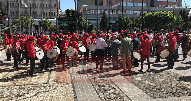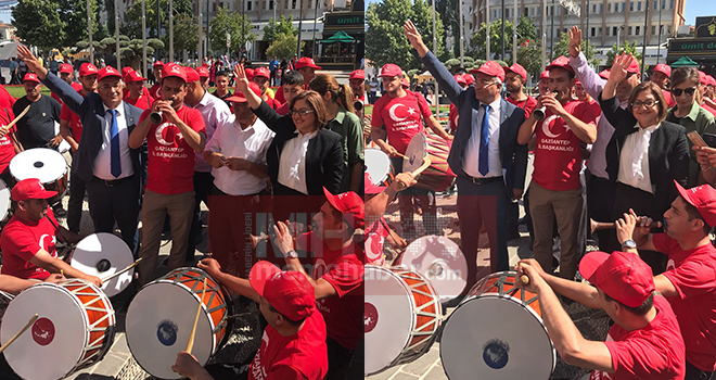 Gaziantep Büyükşehir Belediye Başkanı Fatma Şahin ve AK Parti Gaziantep milletvekili Nejat Koçer, Büyükşehir Belediyesi önünden 'Yeah' çekerek Cumhurbaşkanı Recep Tayyip Erdoğan'ın mitingini gerçekleştireceği Demokrasi Meydanı'na yürüdüler. Yaklaşık 150 kişilik davul-zurna ekibinin üzerindeki Türk Bayraklı tişörtler dikkatlerden kaçmadı.