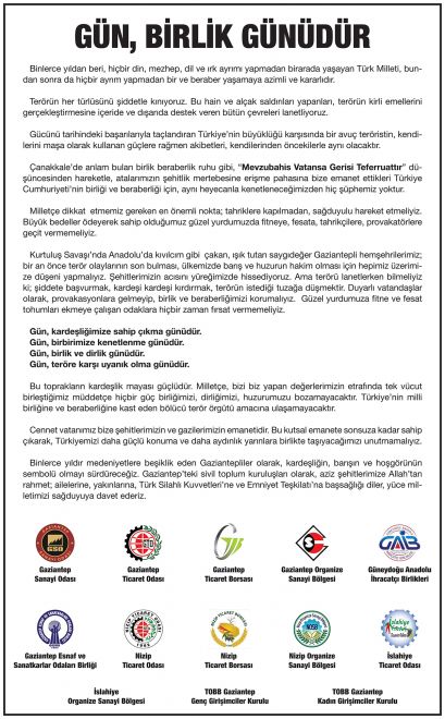 Kurtuluş Savaşı yıllarında düşman kuvvetlerine karşı muhteşem bir direniş destanı yazarak, Anadolu’da milli mücadele ateşini yakan Gaziantep insanı, ülkemizi bölmek ve kardeşi kardeşi kırdırmak isteyen teröre karşı, ‘’tek ses, tek yürek’’ oldu.