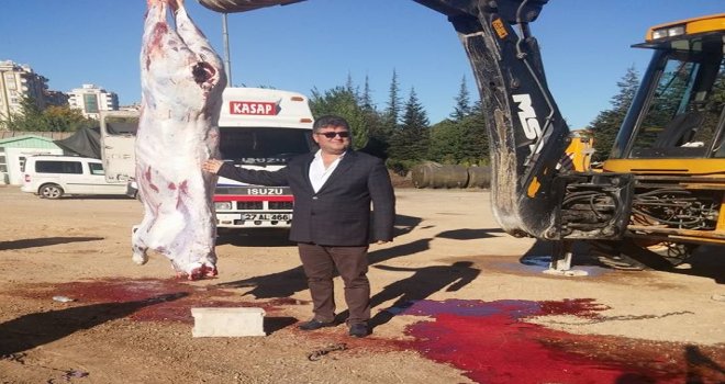 İş adamı Bilal Yıldız, 1 Kasım seçimlerinden Ak Parti'nin zaferle ayrılmasını ilginç bir şekilde kutladı. Bilal Yıldız AK Parti şerefine kestiği danayı ise iş makinasına asarak poz verdi.