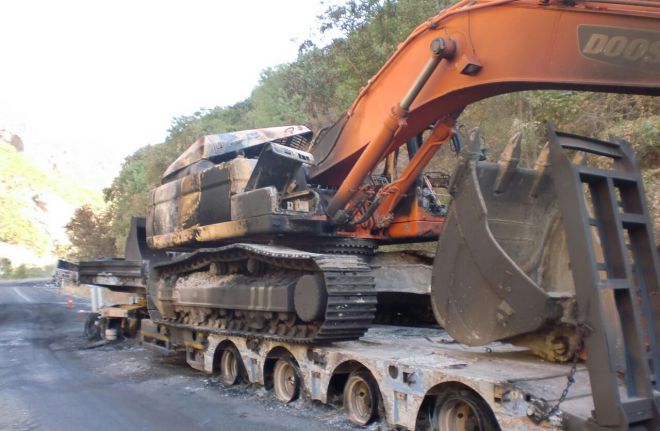 Gaziantep’te Bilay Lojistik adı altında beton delme ve kesme faaliyetleri gösteren inşaat firmasına ait 2 iş makinası Tunceli-Pülümür arasında PKK’lı teröristler tarafından ateşe verilerek yakılmıştı. Gaziantepli iş adamı Bilal Yıldız’ın Bilay Lojistik firmasının Erzincan-Çayırlı kömür ocağında çalışan paletli ekskavatör ve bunu taşıyan iş makinaları Gaziantep’e gelmek için dün yola çıktı. İş makinaları PKK’lı teröristler tarafından Erzincan-Tunceli, Pülümür arasında yol kesip şoför Hüseyin Geçici’yi araçtan indirmek suretiyle iş makinalarını ateşe verip yakılmıştı.