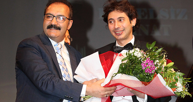 Konserin sonunda Rektör Prof. Dr. Ali Gür; piyanistlere, Türk Musikisi Devlet Konservatuarı Öğr. Gör. Hamdi Hikmet Geçin’e ve konser öncesi fuaye alanında resimleri sergilenen Metehan Elekçi’ye çiçek takdim etti.