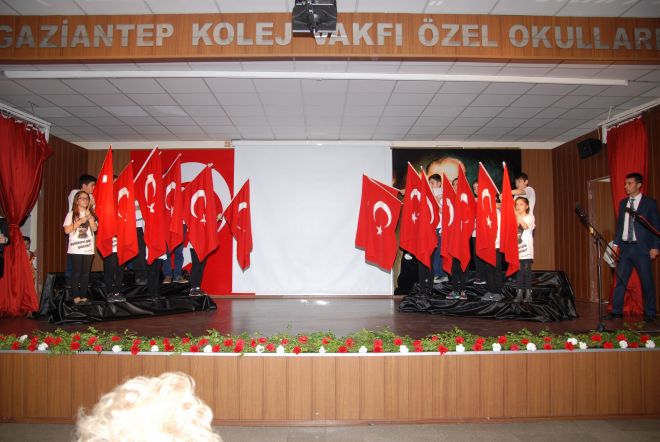 Gaziantep Kolej Vakfı Özel Ortaokulu öğrencileri tarafından sahnelenen “Geri Dönmeyi düşünmediler” oratoryosu izleyenleri duygulandırırken öğrenciler tarafından gerçekleştirilen bayrak Show salonda renkli sahnelere neden oldu.