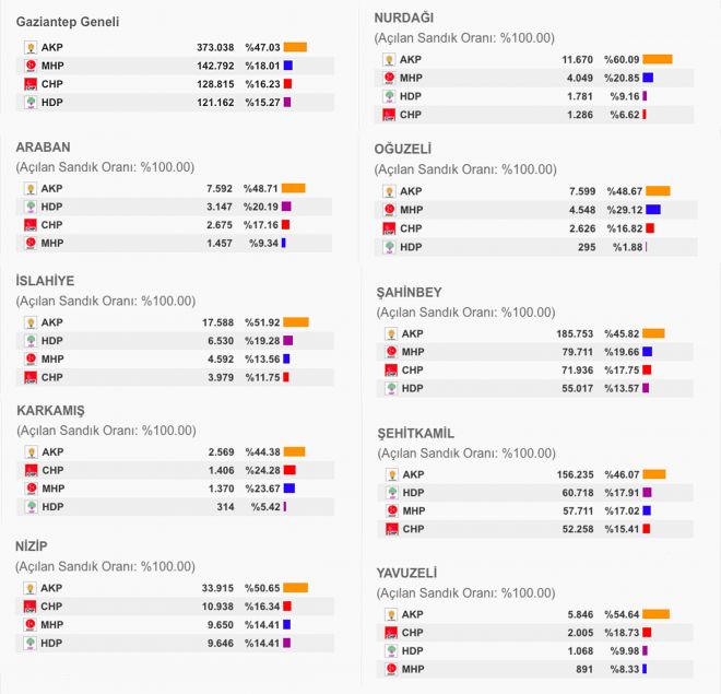 GAZİANTEP'te resmi olan seçim sonuçlarına göre 12 milletvekilliğinden 6'sını Ak Parti, 2'sini CHP, 2'sini MHP, 2'sini ise HDP kazandı.