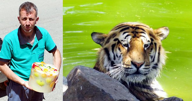 Hava sıcaklığının 40 dereceyi aştığı Gaziantep'te, 325 tür ve 7 bini aşkının hayvanın barındığı Hayvanat Bahçesi'nin sıcaktan etkilenen bazı sakinleri için ise çeşitli tedbirler alındı. Türkiye'nin en büyük, dünyanın ise sayılı hayvanat bahçeleri arasında yer alan Gaziantep Hayvanat bahçesinde ayı, aslan ve kaplanlar gölgeliklerde korunup, günün büyük bölümünü barınaklarındaki havuzlarında geçiriyor. Ancak bakıcılar sıcakların en üst seviyeye çıktığı saatlerde, dondurulmuş meyve kokteyli ve et ile besleyerek serinlemelerine yardımcı oluyor. Ayı ve yırtıcı hayvanların bakıcılarının verdiği buz kokteylleri ile karınlarını doyurarak serinlemesini ziyaretçiler ilgiyle izliyor.
