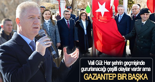 Saygı Duruşu ve İstiklal Marşı’nın okunması ile devam eden törende konuşan Vali Davut Gül, dünyadaki ‘Gazi’ unvanlı tek şehrin Gaziantep olduğunu kaydetti.