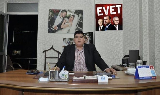 Gaziantepli iş adamı Hilmi Savcılı işyerine 'Evet' afişi asarak referandum oyunu açıkladı.