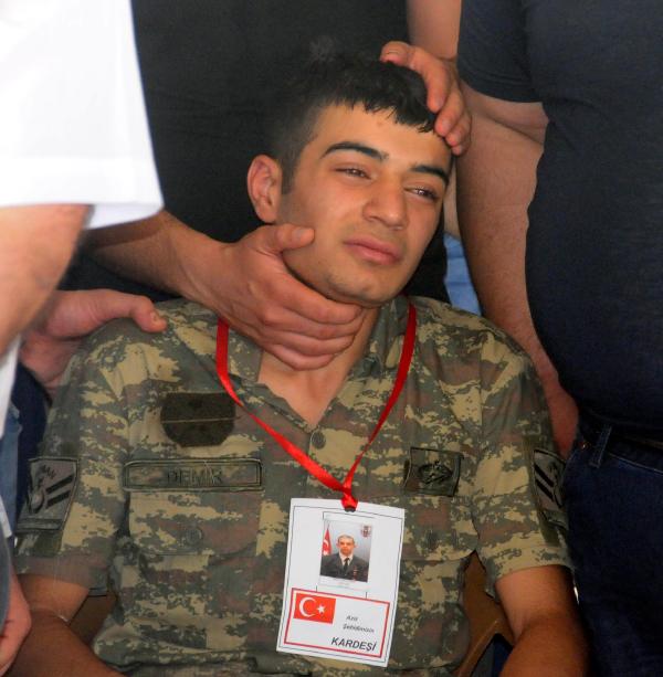 Şehidin kardeşi Alican Demir, ağabeyinin askeri kamuflajı ile törene gelirken, güçlükle ayakta durabildi.